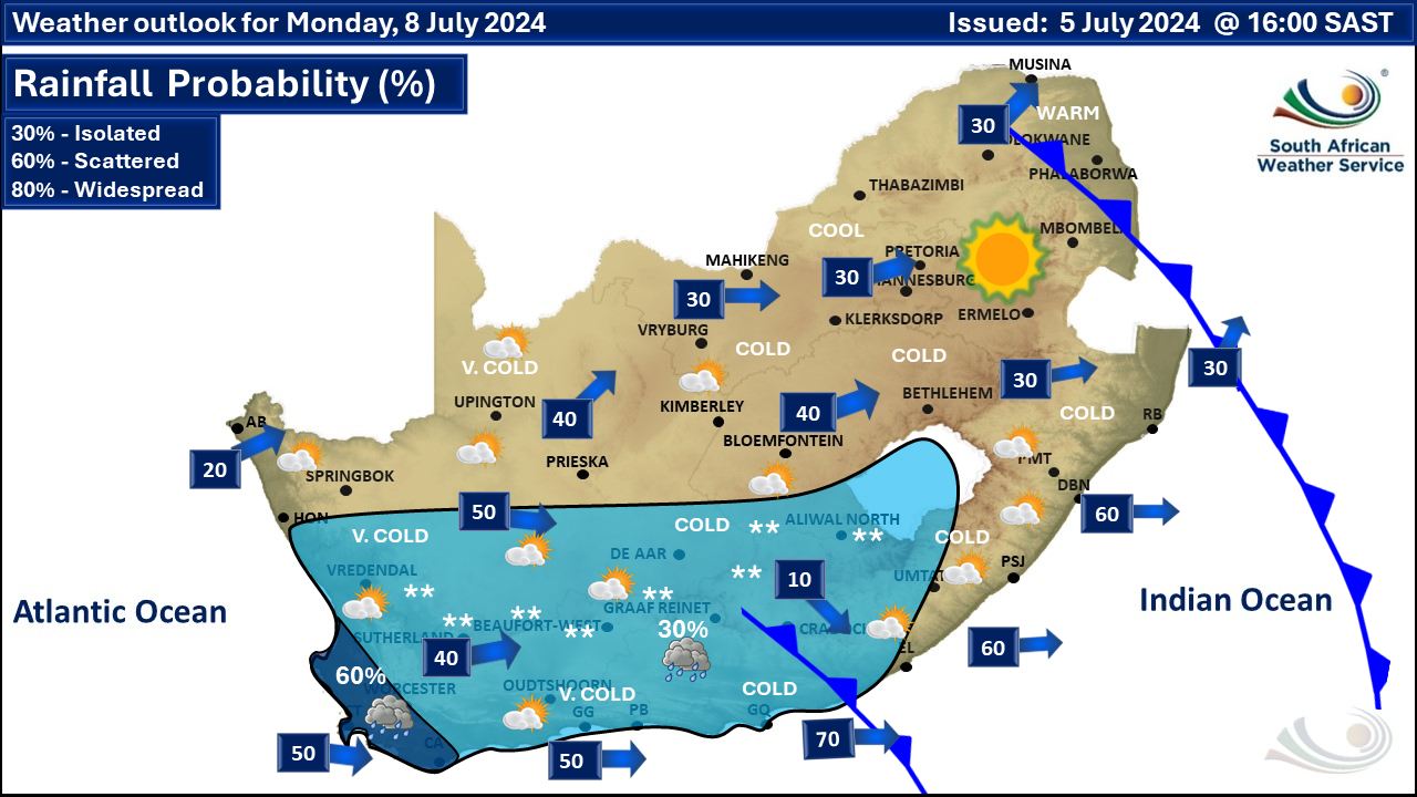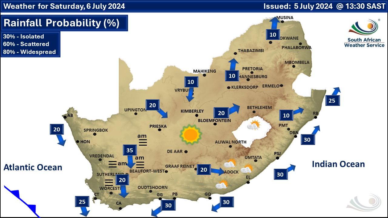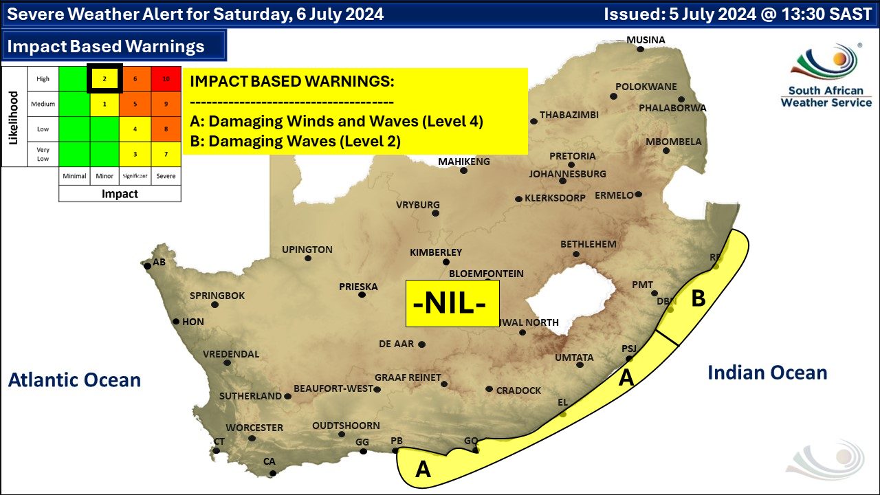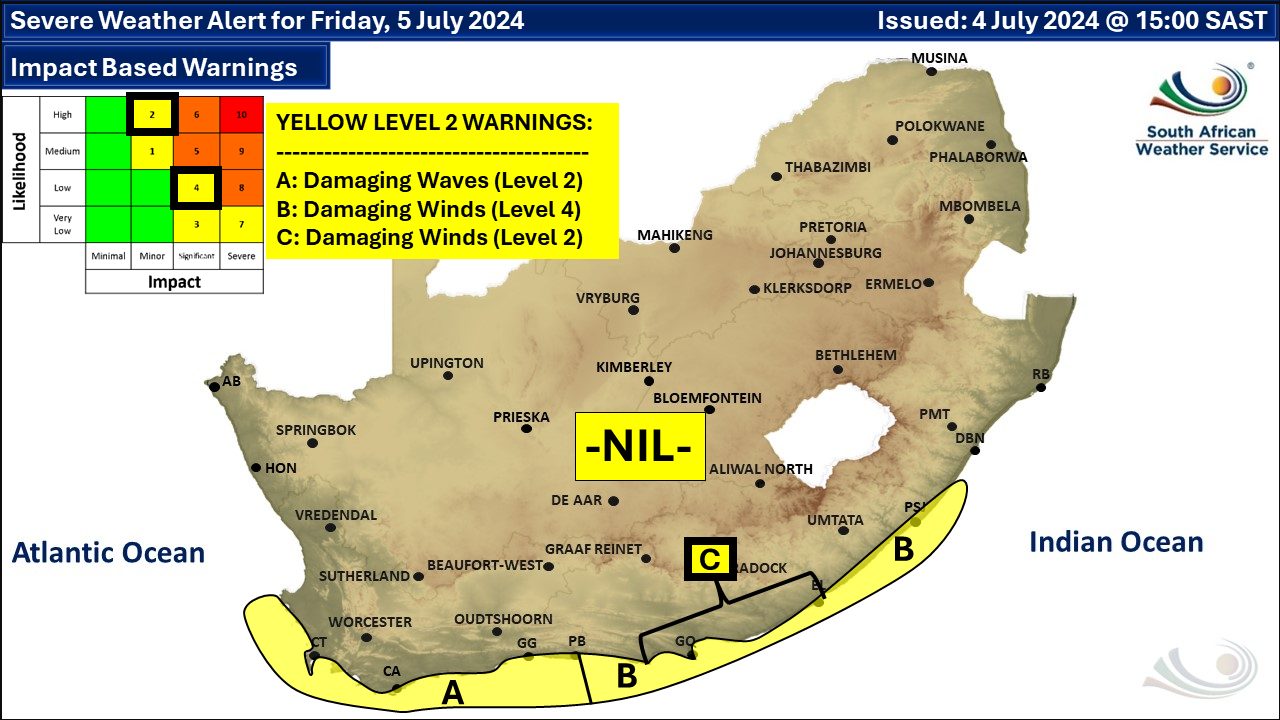 There will be no weather podcast on Friday night. We have however posted a snow podcast for the weekend. A newer weather forecast can be found here. A series of intense cold fronts are expected to affect the Western Cape, Northern Cape and Eastern Cape from Sunday to next Friday, according to the South African Weather Service (SAWS). Mostly fine conditions expected on Saturday ahead of the intense cold front which is expected to make landfall early on Sunday morning. Damaging winds and waves expected along the south-east coast, with a Level 4 warning issued for the Eastern Cape coastline for Saturday. Weather warnings in effect for Saturday from SAWS. A. A yellow level 2 warning for damaging waves are expected between Port Edward and Sodwana Bay tomorrow, leading to disruption of beachfront and harbours/port activities, difficulty navigation, small vessels at risk of taking on water and capsizing in a locality. B. A yellow level 4 warning for damaging wind and waves between Plettenberg Bay and Port Edward resulting in disruption to harbours/ports, difficulty in navigation with vessels at risk of capsizing, dragging anchors and breaking mooring lines. Extremely high fire conditions are expected over Khai-Ma Local Municipality in the Northern Cape on Saturday. SAWS have advised that an intense cold front, with its deepening upper-air trough, will set in over the western parts of the country resulting in wet, very cold, windy conditions, very rough seas as well as snowfalls over the high-lying areas of the Cape provinces and the southern Free State from Sunday into Monday. These cold to very cold and windy conditions are expected to spread into the central, eastern and northern provinces. Weather warnings in effect for Sunday from SAWS. A. An orange level 6 warning for disruptive rain leading to flooding of roads and (formal/informal) settlements is expected over the West Coast, City Of Cape Town, Western Cape Winelands, Valley And Overberg Districts of the Western Cape, but yellow level 2 over Matizikama, Cederberg, Hantam, Karoo Hoogland, Lainburg, Kanneland And Hessequa Local Municipalities Of The Western Cape. B. An orange level 6 warning for damaging coastal winds and waves leading to damage of coastal infrastructure along longer stretches of coastline, disruption to harbours/ports, difficulty in navigation with vessels at risk of capsizing, dragging anchors and breaking mooring lines are expected between Alexander Bay and Algoa Bay, spreading to Port Edward on Monday. C. An orange level 6 warning for damaging interior winds leading to structural damage is expected over the southern West Coast, City Of Cape Town, Western Cape Winelands and Western Overberg Districts of the Western Cape. D. A yellow level 4 warning for damaging interior winds leading disruption to transport routes and travel services affected by wind, falling trees is expected over Namakwa District of the Northern Cape, northern parts of the West Coast District, as well as the central and eastern parts of the Western Cape. F. A yellow level 4 warning for disruptive snow leading to disruption and closure of mountain passes is expected over the Hantam and Karoo Hoogland Local Municipalities of the Northern Cape, as well as Cederberg Municipalities including the Cape Winelands District of the Western Cape. G. A yellow level 4 warning for damaging winds resulting in damage to property, difficult driving conditions and communication and power interruptions are expected over Alfred Nzo, Or Tambo, and Amathole District Municipalities of the Eastern Cape, as well as Ndlambe, Makana, Sundays River, Kouga, and Koukamma Local Municipalities of the Eastern Cape, and also Buffalo City and Nelson Mandela Metro As Well Over The Southern Half Of Both The Northern Cape And Free State. H. An orange level 6 warning for damaging winds resulting in damage to property/settlements and infrastructure, dangerous driving conditions and prolonged communication and power interruptions are expected over Alfred Nzo, Or Tambo, and Amathole District Municipalities of the Eastern Cape, as well as Ndlambe, Makana, Sundays River, Kouga, and Koukamma Local Municiplaities of the Eastern Cape, and also the Nelson Mandela and Buffalo City Metro. Regional forecasts from SAWS for Saturday: GAUTENG Fine and cool. The expected UVB sunburn index: High MPUMALANGA Fine and cold to cool but warm in the Lowveld. LIMPOPO Fine and cool to warm. THE NORTH-WEST PROVINCE Fine and cool. THE FREE STATE Fine and cold to cool. THE NORTHERN CAPE Foggy in the morning over the southern interior, otherwise fine and cold to cool but warm over the coastal regions. The wind along the coast will be moderate to fresh easterly to north-easterly becoming north-westerly in the afternoon. THE WESTERN CAPE Misty conditions are expected over the south-western interior in the morning, otherwise fine and cool to cold but warm along the west coastal areas. The wind along the coast will be moderate to fresh north-easterly to easterly, becoming moderate to fresh northerly to north-westerly along the west and south-west coast in the afternoon, but strong south of Cape Point. The expected UVB sunburn index: Moderate THE WESTERN HALF OF THE EASTERN CAPE Fine and cool, but partly cloudy in the south-east. The wind along the coast will be light to moderate north-westerly in the morning, otherwise moderate to fresh north-easterly. THE EASTERN HALF OF THE EASTERN CAPE Cloudy in places along the coast, otherwise fine and cool, but cold with morning frost in places in the north. The wind along the coast will be moderate to fresh south-westerly. KWAZULU-NATAL Fine and cool but cold in places in the west. The wind along the coast will be moderate to fresh south to south-westerly, becoming light to moderate from the evening. The expected UVB sunburn index: Very High Travellers forecast from SAWS for Saturday PRETORIA Fine. Minimum/Maximum: 0/19°C The expected UVB Sunburn Index: High JOHANNESBURG Fine. Mini