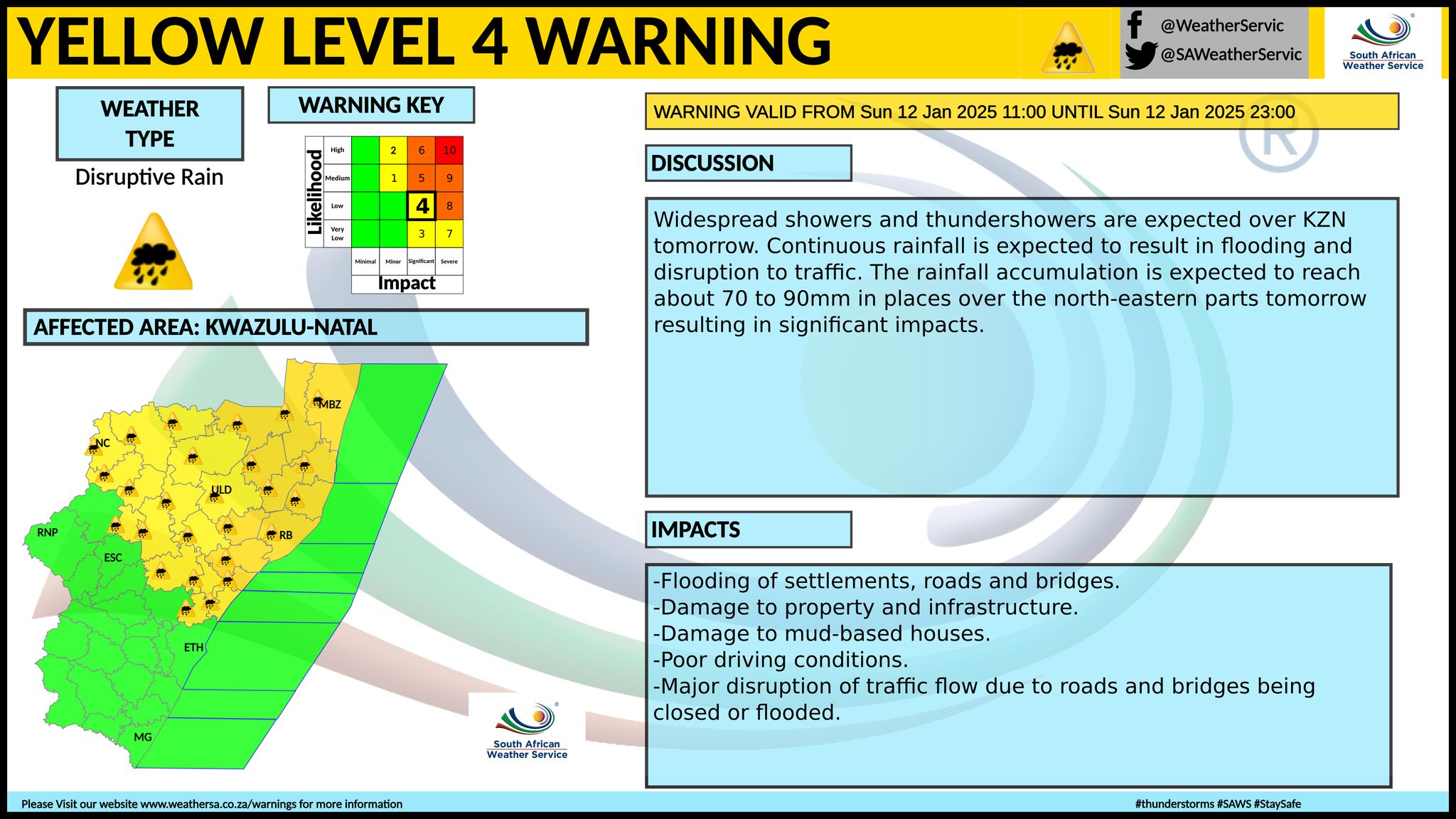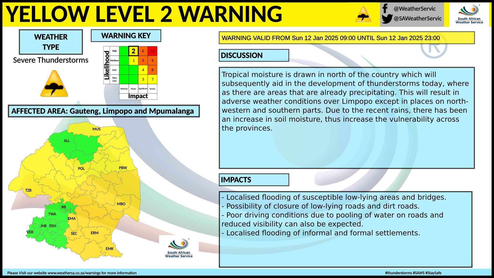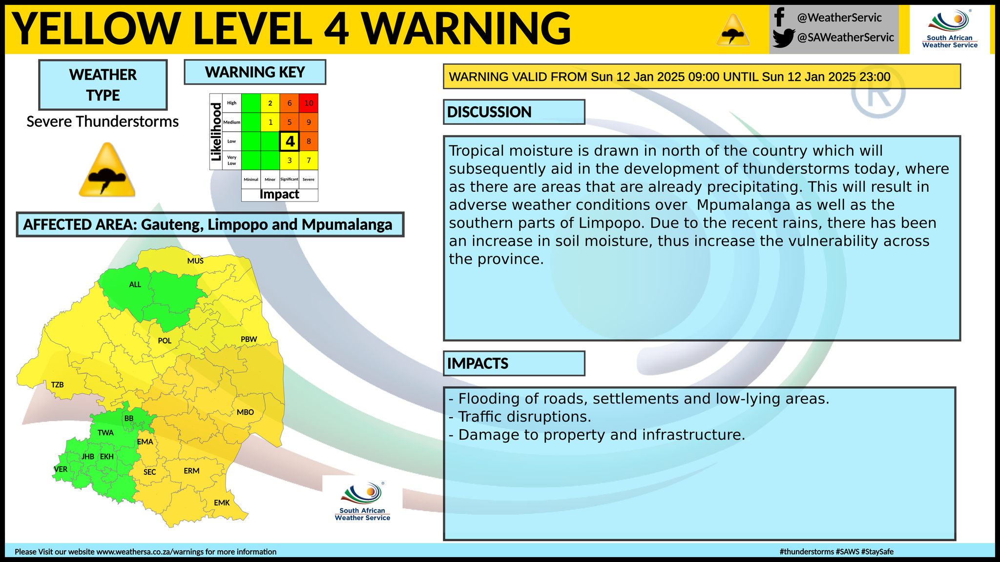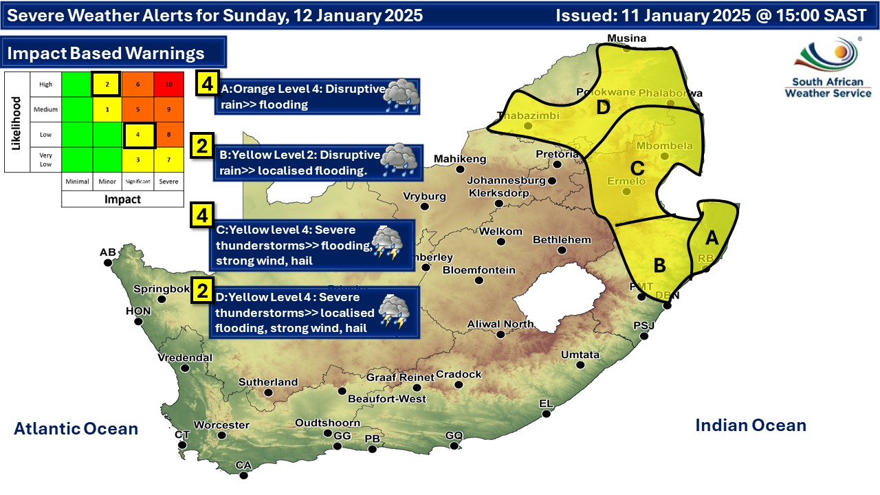 Level 4 warnings for thunderstorms and disruptive rain in the east on Sunday11 January 2025 [updated 12 January]By Staff Writer