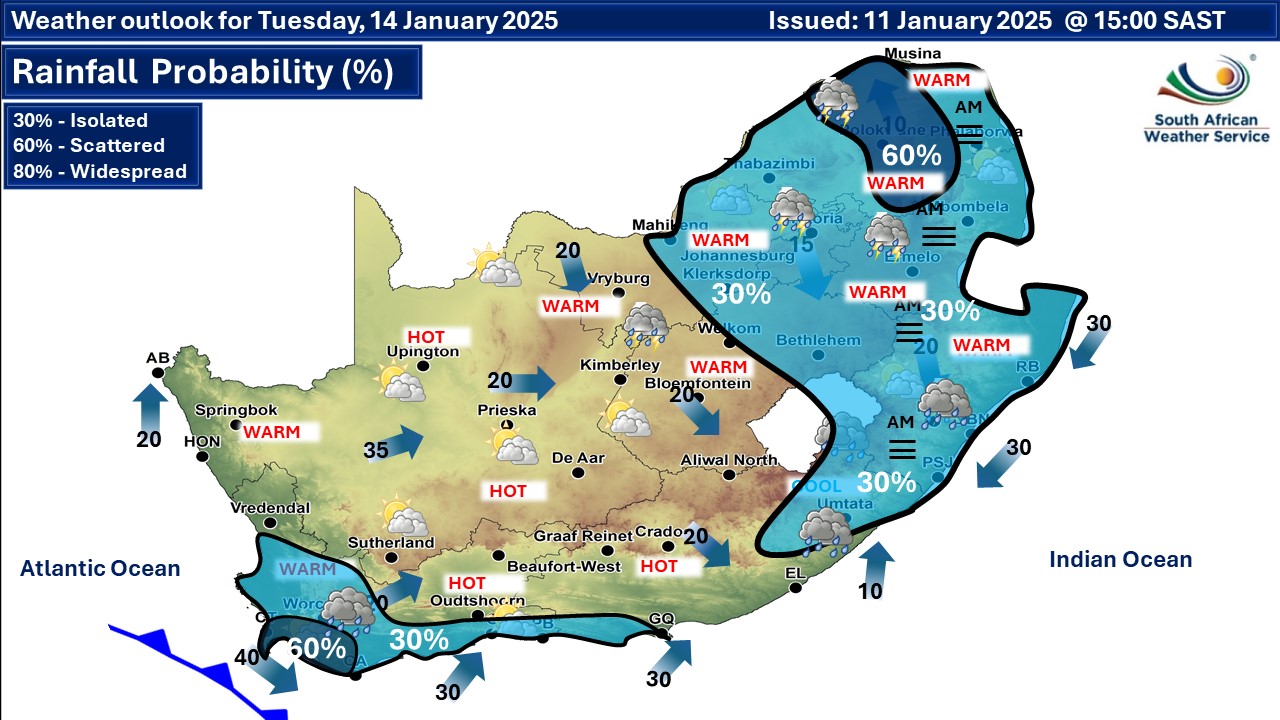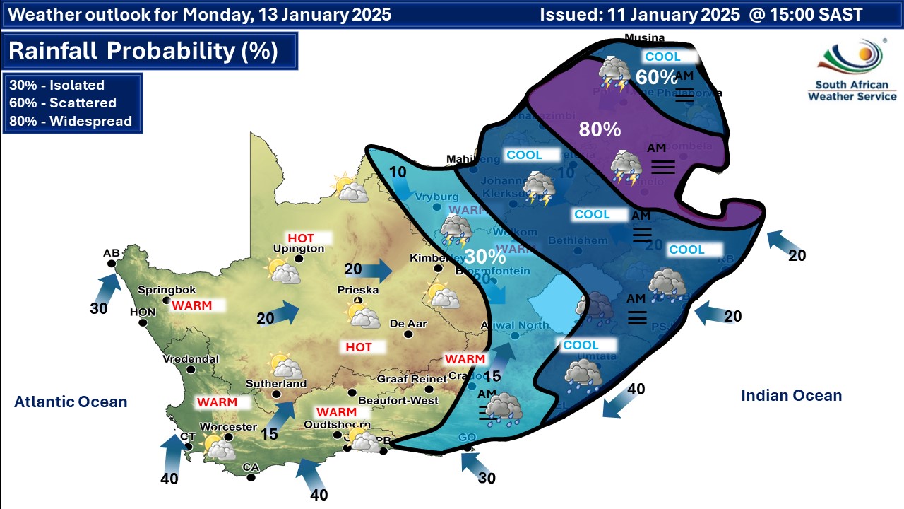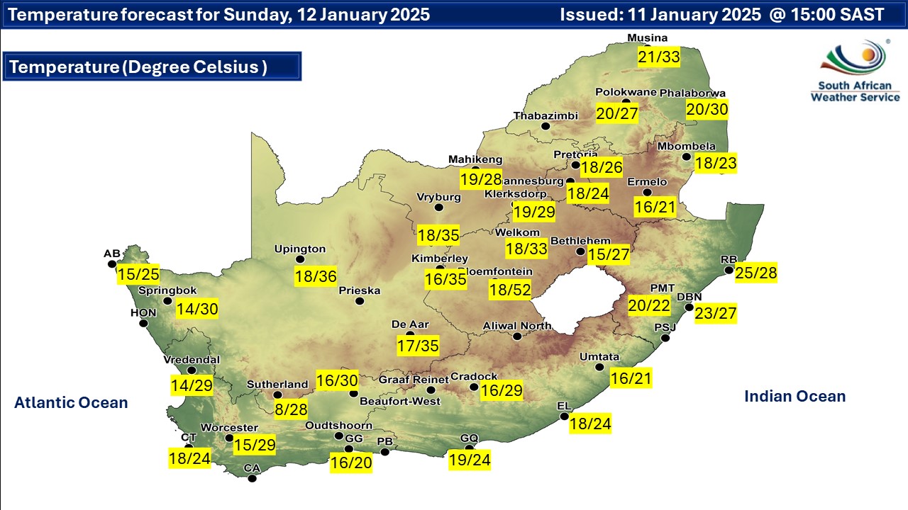 A newer forecast is available by clicking here but the various warnings for Sunday may still apply. Fine and warm to hot weather in the western parts of the country, otherwise cloudy and cool to warm with a 30-60% chance of showers and thundershowers, and an 80% chance in the east, according to the SA Weather Service (SAWS). Warnings from the SA Weather Service for Sunday: A. yellow level 4 warning disruptive rainfall leading to localised flooding and localised damages to infrastructure and low-lying areas and bridges, is expected over the north coast and adjacent interior of KwaZulu-Natal. B. yellow level 4 warning severe thunderstorms with heavy downpours, strong gusty winds And hail leading to flooding of roads and settlements, displacement of affected communities and damage to formal and informal structures are expected over the south-eastern parts of Limpopo as well as Mpumalanga (except for both the extreme north-east and south-western parts of this province). C. yellow level 2 warning severe thunderstorms with heavy downpours, possible strong gusty winds, and hail leading to localised flooding of roads and settlements, displacement of affected communities, and localised damage to formal and informal structures are expected over the extreme north-eastern parts of Mpumalanga as well as the southern and eastern parts of Limpopo. D. yellow level 2 warning disruptive rainfall leading to localised flooding and damages to settlements and infrastructure and low-lying areas and bridges is expected over the northern parts KwaZulu-Natal(except for the north coast and adjacent interior). Extremely high fire danger conditions are expected over the north-eastern parts of the Northern Cape. Regional forecasts from SAWS for Sunday: 1. GAUTENG Cloudy and cool to warm with scattered showers and thundershowers but isolated in the extreme south-west. The expected UVB sunburn index: Low 2. MPUMALANGA Cloudy and cool to warm with widespread showers and thundershowers but scattered in the extreme south-west and extreme north-east. 3. LIMPOPO Cloudy and warm with widespread showers and thundershowers but scattered in the east. 4. NORTH WEST Partly cloudy in the west, otherwise cloudy and warm to hot with isolated to scattered showers and thundershowers in the east. 5. FREE STATE Partly cloudy to cloudy and warm to hot with isolated to scattered showers and thundershowers in the east. 6. NORTHERN CAPE Warm in the south, otherwise fine and warm to hot but very hot in places in the east, where it will become partly cloudy by the afternoon. The wind along the coast will be moderate to fresh southerly to south-easterly but strong from the afternoon until late evening. 7. WESTERN CAPE Partly cloudy to cloudy and cool to warm with isolated showers and rain over the south-west and south coastal areas becoming fine in the west from the evening. It will be hot in the northern parts of the West Coast District. The wind along the coast will be moderate to fresh westerly in the east in the early morning, otherwise moderate to fresh south-easterly to southerly but strong along the west coast from the afternoon spreading to south-west coast from the evening. The expected UVB sunburn index: Extreme 8. WESTERN HALF OF THE EASTERN CAPE Partly cloudy to cloudy and cool to warm with a chance of light rain and showers along the coast, spreading into the interior. The wind along the coast will be moderate south-westerly, becoming fresh south-easterly from late morning. 9. EASTERN HALF OF THE EASTERN CAPE Partly cloudy to cloudy and cool to warm with isolated to scattered showers and rain, except for the extreme north-west. The wind along the coast will be Moderate south-westerly becoming moderate to fresh south-easterly in the afternoon. 10. KWAZULU-NATAL Cloudy and cool to cold but warm in the north-east. Widespread showers and thundershowers are expected but scattered in the south-west. The wind along the coast will be moderate to fresh northerly to north-easterly in the north in the morning, otherwise southerly to south-westerly reaching strong in places, becoming south-easterly by late afternoon. The expected UVB sunburn index: Low Travellers forecasts from SAWS for Sunday: PRETORIA Cloudy with scattered showers and thundershowers. Minimum/Maximum: 18/26°C The expected UVB Sunburn Index: Low JOHANNESBURG Cloudy with scattered showers and thundershowers. Minimum/Maximum: 18/25°C VEREENIGING Cloudy with scattered showers and thundershowers. Minimum/Maximum: 18/26°C MBOMBELA Cloudy with widespread showers and thundershowers. Minimum/Maximum: 18/23°C POLOKWANE Cloudy with widespread showers and thundershowers. Minimum/Maximum: 20/27°C MAHIKENG Cloudy with isolated showers and thundershowers. Minimum/Maximum: 19/28°C VRYBURG Partly cloudy. Minimum/Maximum: 18/35°C BLOEMFONTEIN Fine at first, otherwise partly cloudy. Minimum/Maximum: 18/35°C KIMBERLEY Fine, becoming partly cloudy in the afternoon. Minimum/Maximum: 18/36°C UPINGTON Fine. Minimum/Maximum: 18/36°C CAPE TOWN Partly cloudy, clearing from the evening. Wind: Moderate to fresh southerly to south-easterly but strong from the afternoon until the evening. Minimum/Maximum: 18/24°C The expected UVB Sunburn Index: Extreme GEORGE Cloudy with isolated showers and rain. Wind: Light to moderate north-westerly to westerly at first, otherwise moderate to fresh south-easterly to easterly. Minimum/Maximum: 16/20°C GQEBERHA Cloudy with scattered showers and rain. Wind: Moderate south-westerly, becoming fresh south-easterly from late morning. Minimum/Maximum: 19/24°C EAST LONDON Cloudy with scattered showers and rain. Wind: Moderate south-westerly becoming moderate to fresh south-easterly in the afternoon. Minimum/Maximum: 18/24°C DURBAN Cloudy with widespread showers and thundershowers. Wind: Moderate to fresh southerly to south-westerly becoming south-easterly by late afternoon. Minimum/Maximum: 23/27°C The expected UVB Sunburn Index: Low RICHARDS BAY Cloudy with wide