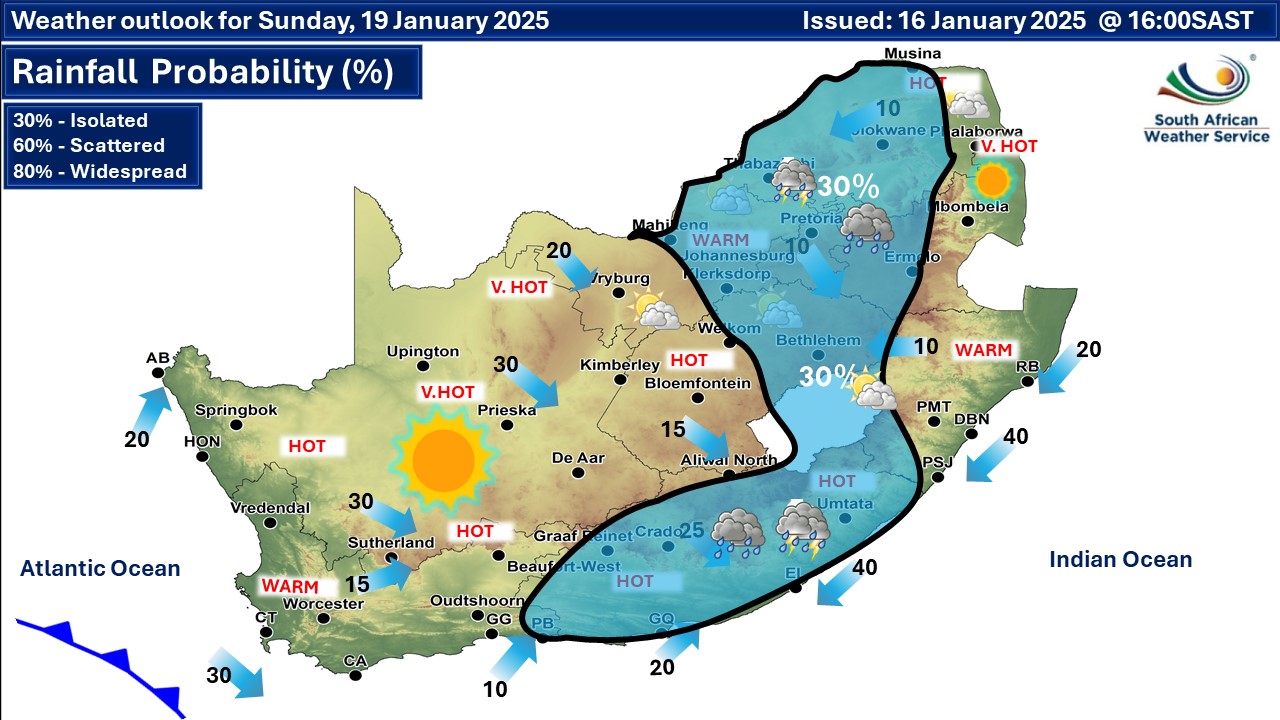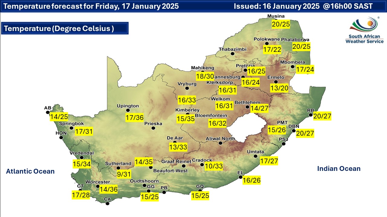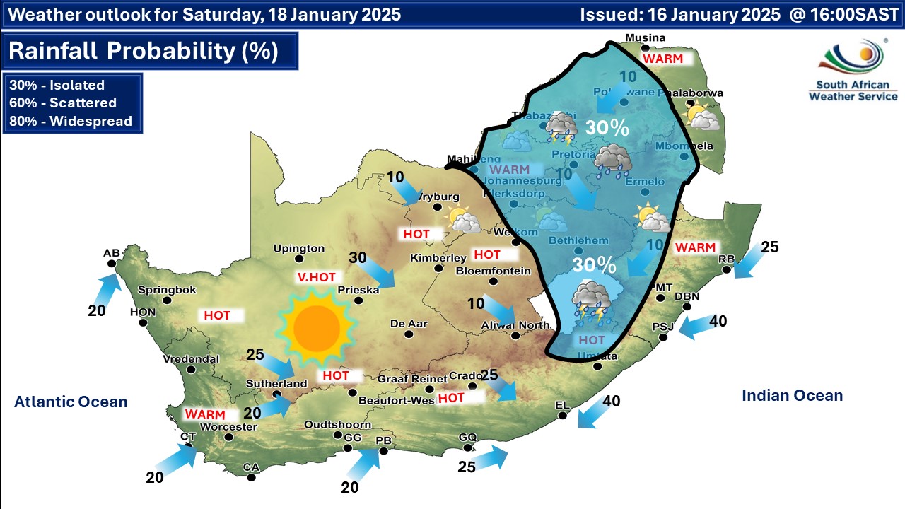 A newer forecast is available by clicking here but any warnings for Friday may still apply. Isolated showers and thundershowers in the central, and eastern parts but scattered in the extreme northern parts of Limpopo on Friday, according to the SA Weather Service (SAWS). Mostly cool to warm temperatures are expected but hot to very hot in places in the central parts of the county. Warnings from the SA Weather Service for Friday: Extremely high fire danger conditions are expected over the north-western parts of the Western Cape, the central and eastern parts of the Northern Cape and the south-western parts of the Free State. Regional forecasts from SAWS for Friday: 1. GAUTENG Cloudy in the morning, otherwise partly cloudy and cool with isolated thundershowers from the afternoon. It will be warm in the north. The expected UVB sunburn index: Moderate 2. MPUMALANGA Morning fog patches with a chance of drizzle along the escarpment, otherwise cloudy and cool to warm with isolated showers and thundershowers. 3. LIMPOPO Cloudy and cool to warm with isolated showers and thundershowers. Morning fog patches with a chance of drizzle is expected along the escarpment. 4. NORTH WEST Cloudy in places at first, otherwise partly cloudy and warm to hot with scattered showers and thundershowers but isolated in the east. 5. FREE STATE Cloudy in places at first with morning fog patches in the east, otherwise partly cloudy and warm to hot with isolated showers and thundershowers. 6. NORTHERN CAPE Cool along the coast, otherwise fine and warm to hot, but partly cloudy with isolated showers and thundershowers in the north-east. The wind along the coast will be moderate south-easterly becoming south-westerly in the afternoon. 7. WESTERN CAPE Partly cloudy in the north-east in the morning, otherwise fine and warm to hot but very hot over the Central and Little Karoo. The wind along the coast will be moderate to fresh easterly to south-easterly becoming moderate south-westerly along the west coast in the afternoon. The expected UVB sunburn index: Extreme 8. WESTERN HALF OF THE EASTERN CAPE Morning fog in patches over the interior, otherwise fine and warm, but hot in the extreme north. The wind along the coast will be moderate to fresh north-easterly. 9. EASTERN HALF OF THE EASTERN CAPE Cloudy in the east at first, otherwise partly cloudy and warm with isolated thundershowers in the east. It will become cloudy with a chance of light evening rain along the wild coast. The wind along the coast will be moderate to fresh north-easterly. 10. KWAZULU-NATAL Morning fog patches over the interior, otherwise cloudy and cool to warm with isolated showers and thundershowers. The wind along the coast will be light to moderate easterly to south-easterly north of Cape St. Lucia, reaching fresh at times, otherwise moderate to fresh north-easterly. The expected UVB sunburn index: High Travellers forecasts from SAWS for Friday: PRETORIA Cloudy in the morning, otherwise partly cloudy with isolated thundershowers from the afternoon. Minimum/Maximum: 16/25°C The expected UVB Sunburn Index: Moderate JOHANNESBURG Cloudy in the morning, otherwise partly cloudy with isolated thundershowers from the afternoon. Minimum/Maximum: 16/24°C VEREENIGING Cloudy in the morning, otherwise partly cloudy with isolated thundershowers from the afternoon. Minimum/Maximum: 15/24°C MBOMBELA Cloudy with morning fog patches and a chance of drizzle. Minimum/Maximum: 17/24°C POLOKWANE Cloudy with isolated showers and thundershowers. Minimum/Maximum: 17/22°C MAHIKENG Cloudy at first, otherwise partly cloudy with isolated showers and thundershowers. Minimum/Maximum: 18/30°C VRYBURG Partly cloudy with scattered showers and thundershowers. Minimum/Maximum: 16/33°C BLOEMFONTEIN Cloudy at first, otherwise partly cloudy with isolated showers and thundershowers. Minimum/Maximum: 16/32°C KIMBERLEY Partly cloudy with isolated showers and thundershowers. Minimum/Maximum: 15/35°C UPINGTON Partly cloudy. Minimum/Maximum: 17/36°C CAPE TOWN Fine. Wind: Moderate to fresh south-easterly. Minimum/Maximum: 17/28°C The expected UVB Sunburn Index: Extreme GEORGE Fine. Wind: Light and variable in the morning, otherwise moderate south-easterly. Minimum/Maximum: 15/25°C GQEBERHA Fine. Wind: Moderate to fresh north-easterly. Minimum/Maximum: 11/25°C EAST LONDON Partly cloudy. Wind: Moderate to fresh north-easterly. Minimum/Maximum: 16/26°C DURBAN Cloudy with isolated showers. Wind: Light and variable until mid-morning, otherwise moderate to fresh north-easterly. Minimum/Maximum: 20/27°C The expected UVB Sunburn Index: High RICHARDS BAY Cloudy with isolated showers. Wind: Light and variable until late morning, otherwise moderate to fresh easterly to north-easterly. Minimum/Maximum: 20/27°C PIETERMARITZBURG Morning fog patches, otherwise cloudy with isolated showers. Minimum/Maximum: 15/26°C This forecast is usually updated a few times per day.
