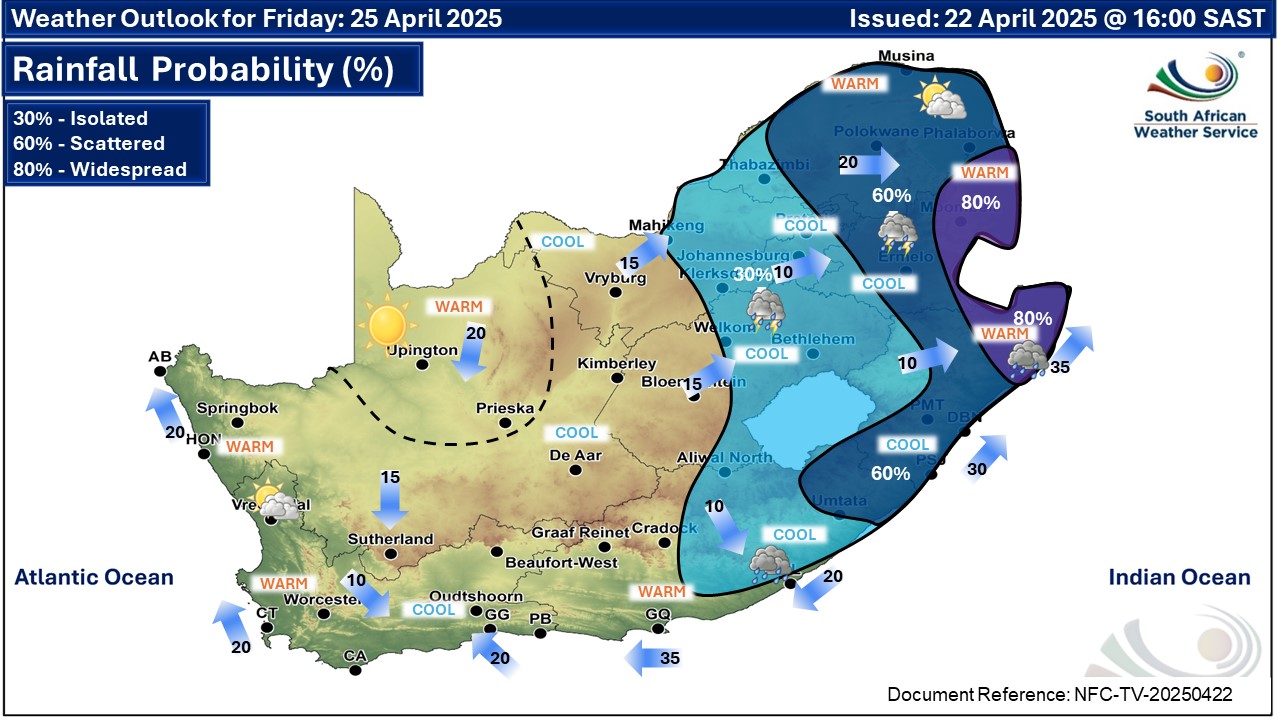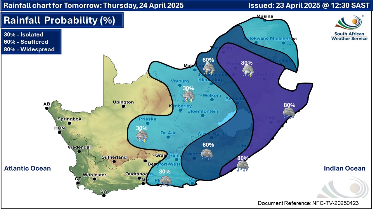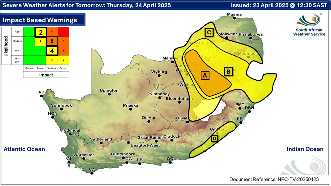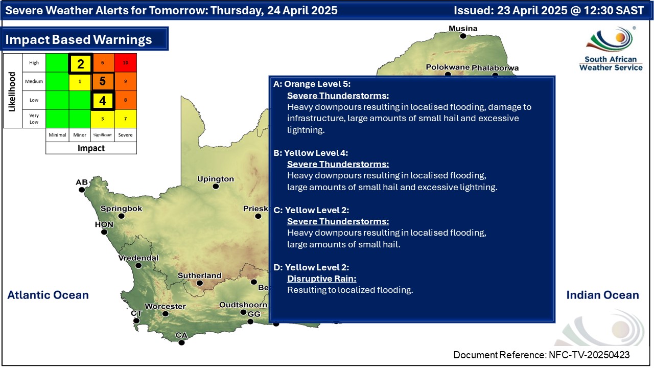 A newer forecast is available by clicking here. The SA Weather Service has confirmed that a cut-off low (COL) system is expected to make landfall over the western interior of South Africa on Wednesday and is expected to move slowly eastwards, exiting the country by Saturday. Scattered to widespread showers and thundershowers are expected over the central and eastern parts of the country, with rainfall accumulations exceeding 50mm in the eastern regions on Wednesday and Thursday (some data indicates much more that in some areas). Cold and wet conditions can be expected over the central and western parts of KwaZulu-Natal until Thursday, but very cold over the south-western high grounds where light snowfall is possible (see our latest snow forecast for more details). SA Weather says snowfalls are also likely over the Drakensberg mountains in Lesotho, KwaZulu-Natal, and the Eastern Cape during this period. SEE ALSO: Heavy snow looking more likely for Lesotho from Tuesday and Wednesday. This would now be the third snowfall of 2025 in Southern Africa, with snow falling on the Swartberg mountains near Oudtshoorn in the Western Cape in late March and in Lesotho in the week leading up to Easter. Daytime temperatures are also expected to drop significantly across most parts of the country from Wednesday onwards, with a gradual recovery from Friday onwards. Warnings from the SA Weather Service for Wednesday: A. orange level 5 warning severe thunderstorms resulting in heavy downpours leading to flooding of roads and bridges, damage to property and infrastructure as well as agricultural activities are expected over the eastern parts of Free State. B. yellow level 4 warning severe thunderstorms resulting in heavy downpours leading to localised flooding of roads and bridges, large amounts of small hail and excessive lightning are expected over parts of KwaZulu-Natal, the Free State, Mpumalanga and Gauteng. C. yellow level 2 warning severe thunderstorms leading to localised damage to settlements, localised flooding of susceptible roads, low-lying areas and bridges are expected over parts of the Northern Cape, Free State, North West, Gauteng, Limpopo and Mpumalanga. D. yellow level 1 warning severe thunderstorms over parts of the Eastern Cape. Regional forecasts from SAWS for Wednesday: 1. GAUTENG Warm in the north, othwerwise cloudy and cool with scattered showers and thundershowers but widespread in the south-west. The expected UVB sunburn index: Moderate 2. MPUMALANGA Morning fog along the escarpment, otherwise cloudy and cool with isolated to scattered showers and thundershowers but widespread in the south-west, except in the Lowveld where it will be warm. 3. LIMPOPO Cloudy and warm with isolated showers and thundershowers in western and southern parts but scattered in the extreme south-west. 4. NORTH WEST PROVINCE Cloudy and warm to cool with scattered showers and thundershowers but widespread over the central and southern parts. 5. FREE STATE Cloudy and cool to cold with scattered showers and thundershowers but widespread in the east. 6. NORTHERN CAPE Morning fog patches along the coast, otherwise cool to cold with isolated showers and thundershowers in the central parts but scattered in the east. It will be warm in the north. The wind along the coast will be light and variable, becoming moderate to fresh southerly to south-easterly from the afternoon. 7. WESTERN CAPE Morning fog patches along the west coast, otherwise cloudy to partly cloudy and cool to warm with isolated showers and thundershowers over the north-eastern parts. The wind along the coast will be light and variable in the morning along the west coast, otherwise fresh to strong southerly to south-easterly. The expected UVB sunburn index: High 8. WESTERN HALF OF THE EASTERN CAPE Cloudy and cold to cool with scattered showers and rain, but isolated in the extreme west. The wind along the coast will be light to moderate easterly, becoming south-westerly from the west in the evening. 9. EASTERN HALF OF THE EASTERN CAPE Cloudy and cold with scattered showers and rain. The wind along the coast will be light to moderate north-easterly, reaching fresh in places. 10. KWAZULU-NATAL Cool in the north-east and along the coast, otherwise cloudy and cold but very cold in the extreme south-west. Scattered showers and thundershowers are expected but widespread in the west and isolated again in the north-east. The wind along the coast will be light to moderate southerly to south-easterly but fresh in the north. The expected UVB sunburn index: High Travellers forecasts from SAWS for Wednesday: PRETORIA Cloudy with scattered showers and thundershowers. Minimum/Maximum: 14/23°C The expected UVB Sunburn Index: Moderate JOHANNESBURG Cloudy with widespread showers and thundershowers. Minimum/Maximum: 13/21°C VEREENIGING Cloudy with widespread showers and thundershowers. Minimum/Maximum: 13/19°C MBOMBELA Cloudy with isolated showers and thundershowers. Minimum/Maximum: 19/23°C POLOKWANE Cloudy with isolated showers and thundershowers. Minimum/Maximum: 14/26°C MAHIKENG Cloudy with scattered showers and thundershowers. Minimum/Maximum: 16/23°C VRYBURG Cloudy with scattered showers and thundershowers. Minimum/Maximum: 14/19°C BLOEMFONTEIN Cloudy with scattered showers and thundershowers. Minimum/Maximum: 13/18°C KIMBERLEY Cloudy and windy with scattered showers and thundershowers. Minimum/Maximum: 14/20°C UPINGTON Partly cloudy with isolated showers and thundershowers. Minimum/Maximum: 16/25°C CAPE TOWN Partly cloudy in the morning, otherwise fine. Wind: Moderate south-easterly. Minimum/Maximum: 14/23°C The expected UVB Sunburn Index: High GEORGE Cloudy. Wind: Light and variable. Minimum/Maximum: 12/18°C GQEBERHA Cloudy with scattered showers and rain. Wind: Light easterly, but light and variable at times. Minimum/Maximum: 15/19°C EAST LONDON Cloudy with scattered showers and rain. Wind: Light northerly at first, otherwise moderate to north-easterl