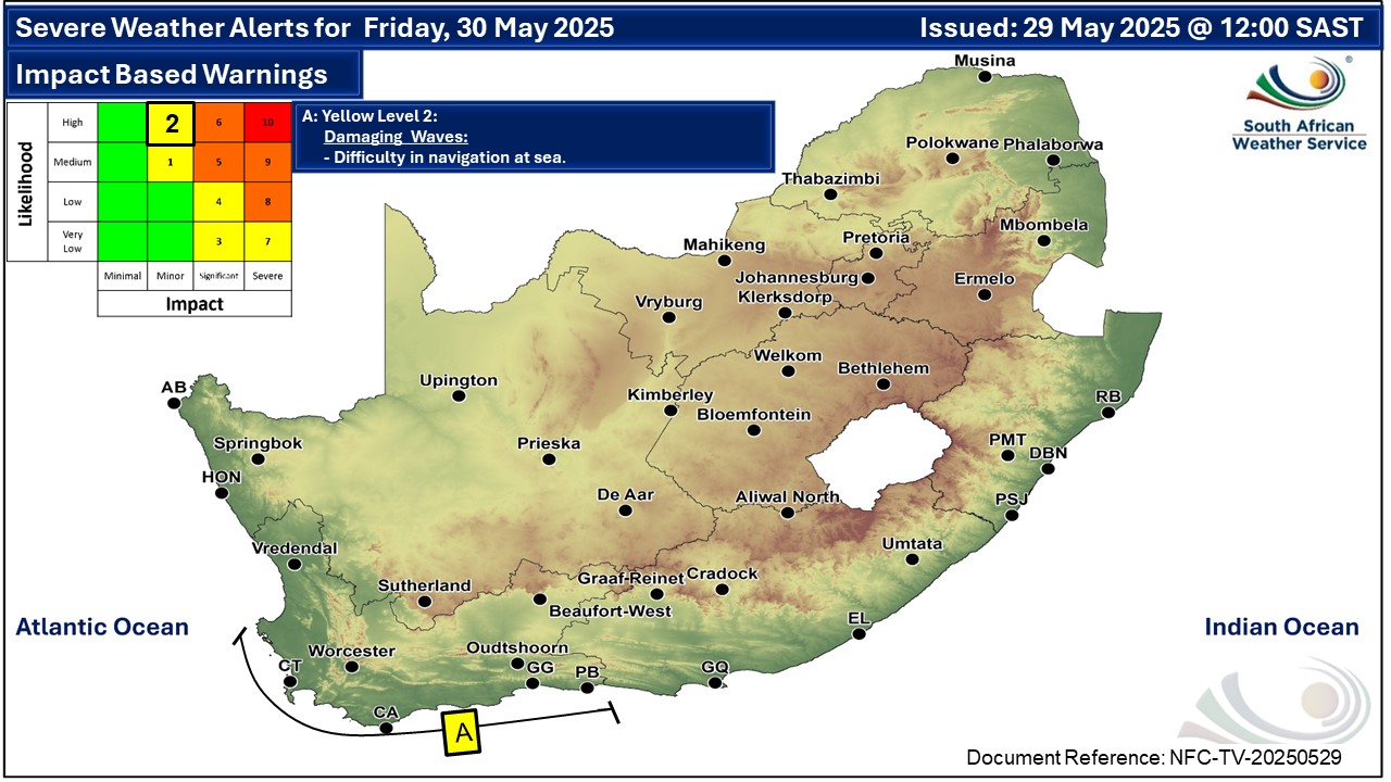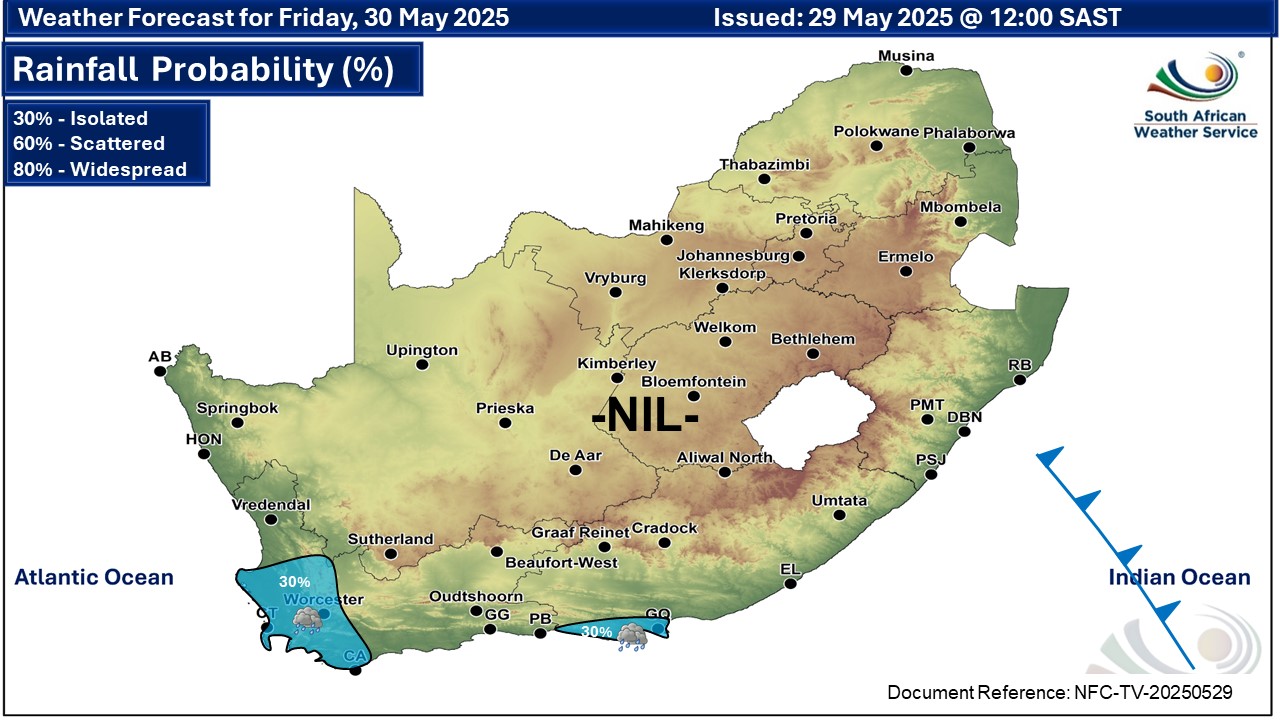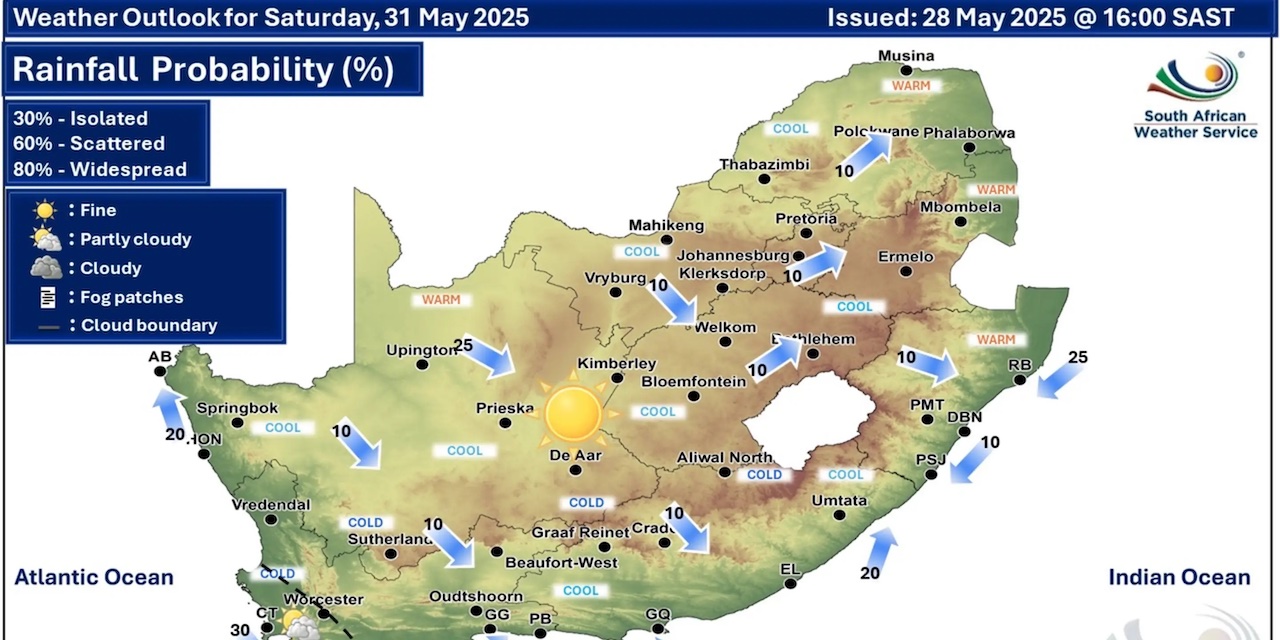 A newer forecast is available by clicking here. Fine and cool to warm across the country but partly cloudy with light rain and showers in the south-west on Wednesday, according to the SA Weather Service (SAWS). Warnings from the SAWS from Thursday: A. level 2 warning for damaging wind leading to difficulty in navigation at sea, is expected between Saldanha Bay and Cape Agulhas. B. level 2 warning for damaging waves leading to difficulty in navigation at sea, are expected between Saldanha Bay and Cape Agulhas, spreading to Plettenberg Bay from Friday until Sunday. Regional forecasts from SAWS for Thursday: 1. GAUTENG Fine and cool. The expected UVB sunburn index: Very High 2. MPUMALANGA Fine and cool to warm. 3. LIMPOPO Fine and cool to warm. 4. NORTH-WEST PROVINCE Fine and cool, with windy conditions in the extreme west. 5. FREE STATE Fine and cool, with windy conditions in the extreme west. 6. NORTHERN CAPE Cloudy to partly cloudy in the west where it will be cold in places, otherwise fine and cool to warm. It will be windy at times in the central and eastern parts. The wind along the coast will be moderate to fresh northerly to north-westerly, becoming light to moderate southerly to south-westerly. 7. WESTERN CAPE Cloudy over the south-western parts with isolated showers and rain, otherwise partly cloudy and cold to cool. The wind along the coast will be fresh to strong northerly to north-westerly, reaching near-gale force along the south-west coast, but strong westerly to south-westerly along the south coast. The expected UVB sunburn index: Low 8. WESTERN HALF OF THE EASTERN CAPE Fine and cool, becoming cloudy with fog in the south-east from the evening. The wind along the coast will be light westerly, becoming south-westerly from midday. 9. EASTERN HALF OF THE EASTERN CAPE Fine and cool to warm, becoming cloudy with fog in places south of the escarpment from the evening. The wind along the coast will be light westerly, becoming south-easterly in the afternoon. 10. KWAZULU-NATAL Fine and cool but warm in the east. The wind along the coast will be light to moderate northerly to north-easterly, reaching fresh in the north, becoming light westerly to south-westerly in the south from the afternoon. The expected UVB sunburn index: Very High Travellers forecasts from SAWS for Thursday: PRETORIA Fine. Minimum/Maximum: 06/22°C The expected UVB Sunburn Index: Very High JOHANNESBURG Fine. Minimum/Maximum: 06/20°C VEREENIGING Fine. Minimum/Maximum: 04/22°C MBOMBELA Fine. Minimum/Maximum: 10/25°C POLOKWANE Fine. Minimum/Maximum: 09/23°C MAHIKENG Fine. Minimum/Maximum: 07/22°C VRYBURG Fine. Minimum/Maximum: 05/23°C BLOEMFONTEIN Fine. Minimum/Maximum: 02/22°C KIMBERLEY Fine and windy. Minimum/Maximum: 08/24°C UPINGTON Fine and windy. Minimum/Maximum: 10/25°C CAPE TOWN Cloudy with isolated showers and rain. Wind: Moderate to fresh north to north-westerly. Minimum/Maximum: 14/19°C The expected UVB Sunburn Index: Low GEORGE Partly cloudy. Wind: Moderate north-westerly becoming light south-westerly from the afternoon. Minimum/Maximum: 11/22°C GQEBERHA Fine. Wind: Light westerly, becoming south-westerly towards midday. Minimum/Maximum: 13/21°C EAST LONDON Fine. Wind: Light westerly, becoming south-easterly in the afternoon. Minimum/Maximum: 15/23°C DURBAN Fine. Wind: Light north-westerly until mid-morning, otherwise north-easterly, becoming light and variable from late afternoon. Minimum/Maximum: 15/26°C The expected UVB Sunburn Index: Very High RICHARDS BAY Fine. Wind: Light to moderate northerly to north-easterly. Minimum/Maximum: 16/28°C PIETERMARITZBURG Fine. Minimum/Maximum: 09/27°C This forecast is usually updated a few times per day.