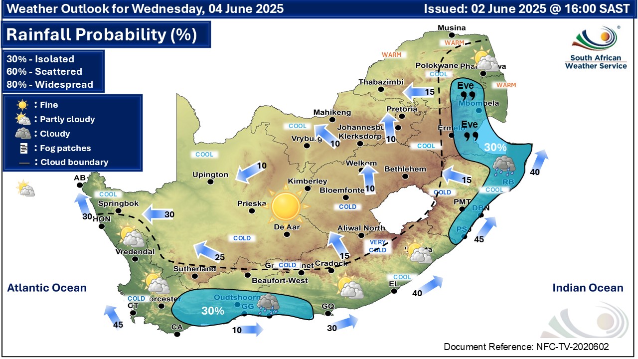 Rain expected along the south coast on Tuesday and cold in the interiorBy Staff WriterPublished: 2 June 2025 This forecast is for: Tue 03 June 2025 The maps cover: Tue 03 Jun – Thu 05 Jun