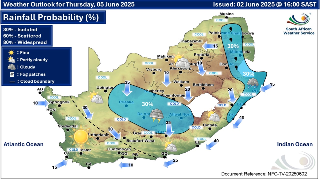 A newer forecast is available by clicking here. Isolated rain and showers along the south coast on Tuesday, according to the SA Weather Service (SAWS) forecast data. From Wednesday it should be partly cloudy and cold to cool with isolated showers and rain in places. ALSO READ: Comrades Marathon weekend: Snowfall possible across SA and Lesotho – Gauteng and the N3 indicated. Warnings from the SAWS from Tuesday: none Regional forecasts from SAWS for Tuesday: 1. GAUTENG Fine and cool. The expected UVB sunburn index: High 2. MPUMALANGA Fine and cool and to warm. 3. LIMPOPO Morning fog in places over the Western Bushveld, otherwise fine and warm. 4. NORTH-WEST PROVINCE Partly cloudy in the west, otherwise fine and cool. 5. FREE STATE Partly cloudy in the north, otherwise fine and cool to cold. 6. NORTHERN CAPE Morning fog over the southern high-ground where it will be partly cloudy and cold in places, otherwise fine and cool to warm. It will be windy in the central and eastern parts. The wind along the coast will be light to moderate south-easterly. 7. WESTERN CAPE Fine over the eastern interior at first with morning fog patches, otherwise partly cloudy cool but cloudy in the south-west with light rain and showers, spreading along the west and south coast from the afternoon. The wind along the coast will be moderate to fresh south-westerly. The expected UVB sunburn index: Low 8. WESTERN HALF OF THE EASTERN CAPE Fine and cool to cold, becoming cloudy along the coast in the afternoon, with light rain in places. The wind along the coast will be light north-westerly at first, otherwise fresh to strong south-westerly. 9. EASTERN HALF OF THE EASTERN CAPE Fine and cool. The wind along the coast will be light to moderate westerly, becoming moderate to fresh south-westerly from late morning, but light north-westerly in the evening. 10. KWAZULU-NATAL Fine in the morning, otherwise partly cloudy and cool but warm in the north-east. The wind along the coast will be moderate to fresh northerly to north-westerly, becoming moderate to fresh southerly to south-westerly along the south coast in the late morning, spreading to the north coast by the afternoon. The expected UVB sunburn index: Very High Travellers forecasts from SAWS for Tuesday: PRETORIA Fine. Minimum/Maximum: 04/21°C The expected UVB Sunburn Index: High JOHANNESBURG Fine. Minimum/Maximum: 03/21°C VEREENIGING Fine. Minimum/Maximum: 0/20°C MBOMBELA Fine. Minimum/Maximum: 06/25°C POLOKWANE Fine. Minimum/Maximum: 04/25°C MAHIKENG Fine. Minimum/Maximum: 04/22°C VRYBURG Fine. Minimum/Maximum: 02/23°C BLOEMFONTEIN Fine. Minimum/Maximum: 04/21°C KIMBERLEY Fine. Minimum/Maximum: 05/24°C UPINGTON Fine. Minimum/Maximum: 06/23°C CAPE TOWN Cloudy with rain in the morning, becoming partly cloudywith showers in the afternoon. Wind: Light northerly becoming moderate southerly from the afternoon. Minimum/Maximum: 12/16°C The expected UVB Sunburn Index: Low GEORGE Cloudy with showers from the afternoon. Wind: Light to moderate westerly. Minimum/Maximum: 09/16°C GQEBERHA Fine, becoming cloudy in the evening. Wind: Moderate westerly, becoming fresh to strong south-westerly from late morning. Minimum/Maximum: 13/19°C EAST LONDON Fine. Wind: Moderate to fresh south-westerly. Minimum/Maximum: 13/21°C DURBAN Fine in the morning, otherwise partly cloudy. Wind: Light to moderate northerly to north-westerly until early morning, otherwise moderate to fresh southerly to south-westerly. Minimum/Maximum: 12/23°C The expected UVB Sunburn Index: Very High RICHARDS BAY Fine in the morning, otherwise partly cloudy. Wind: Light northerly to north-westerly until late morning, otherwise moderate to fresh southerly to south-westerly. Minimum/Maximum: 12/25°C PIETERMARITZBURG Fine in the morning, otherwise partly cloudy. Minimum/Maximum: 06/25°C This forecast is usually updated a few times per day.